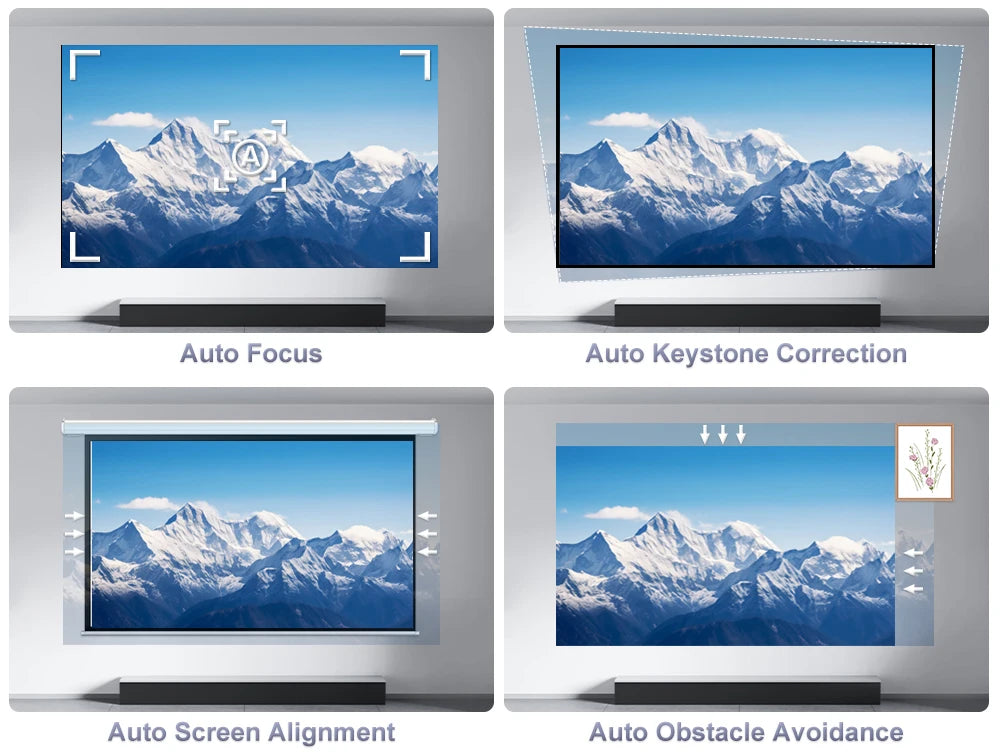 Automatically completes on startup: focus + keystone correction + obstacle avoidance + screen adaptation (no manual adjustment needed)